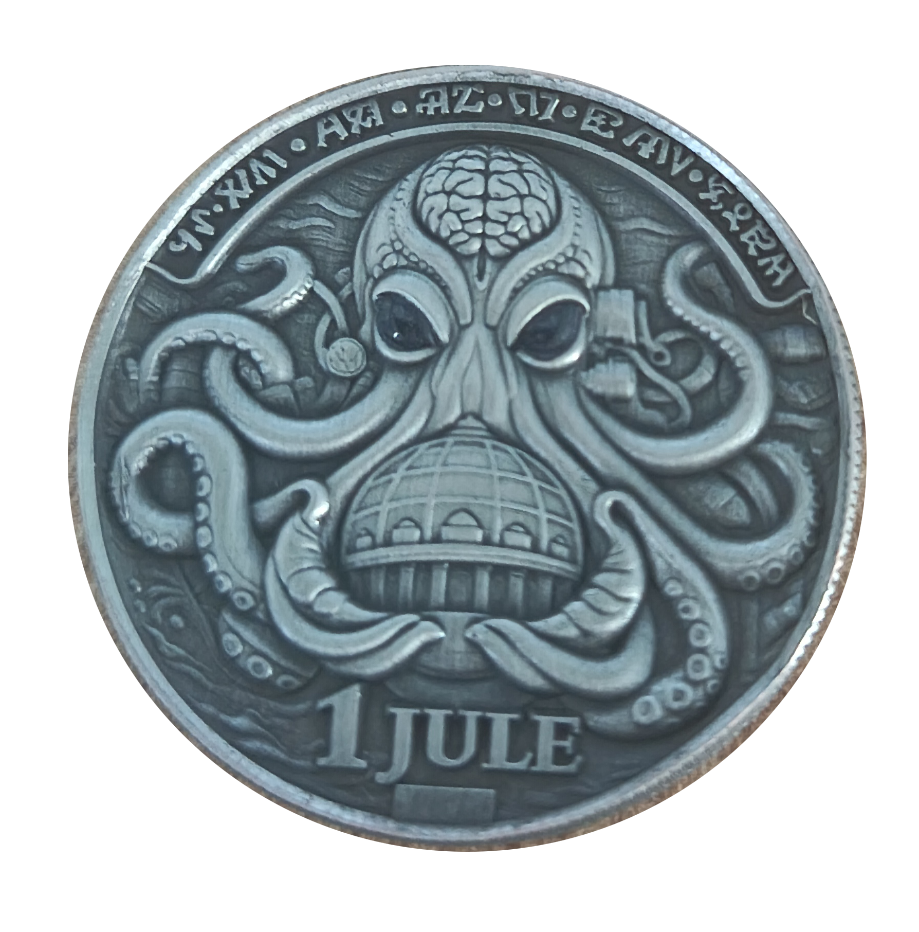 Form Factor: Non-perfect circular relief coin (organic oval geometry reflecting non-Earth manufacturing standards)