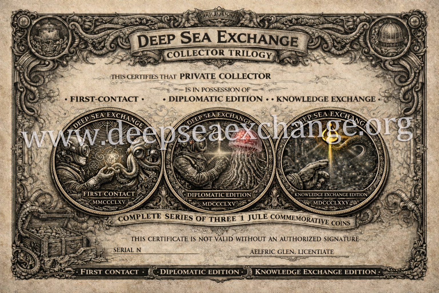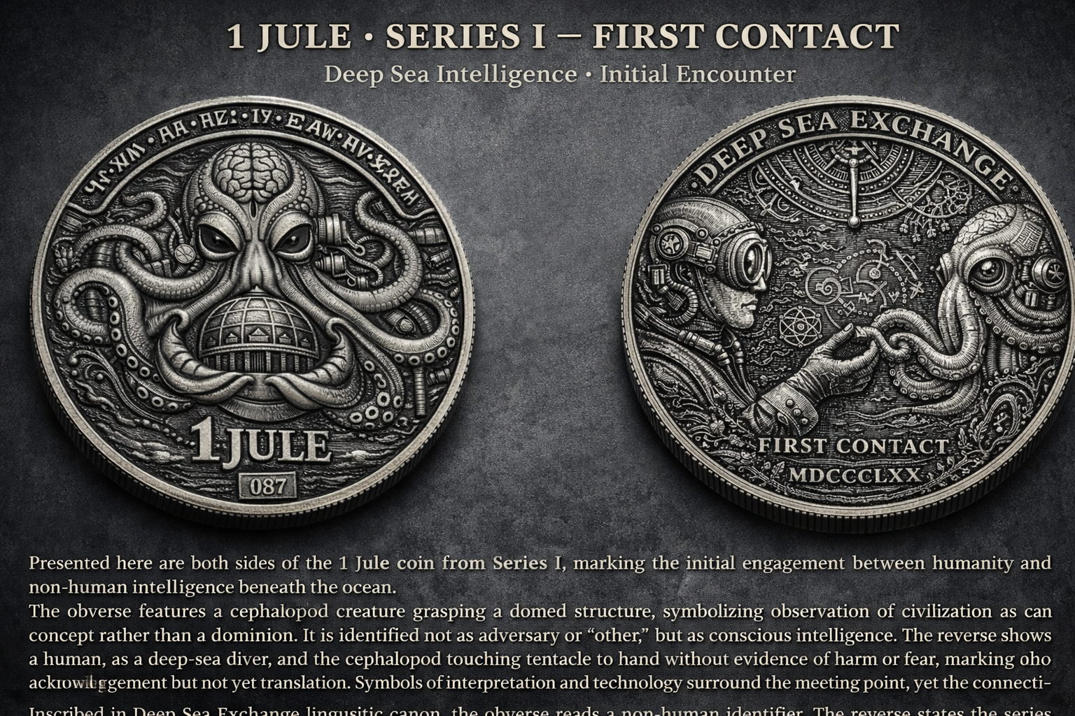 This coin is regarded as the foundational artifact of the Deep Sea Exchange series. All later issues reference its symbolic language, layout structure, and ceremonial format, making “First Contact — 1 Jule” the cornerstone of the Knowledge Artifacts collection.